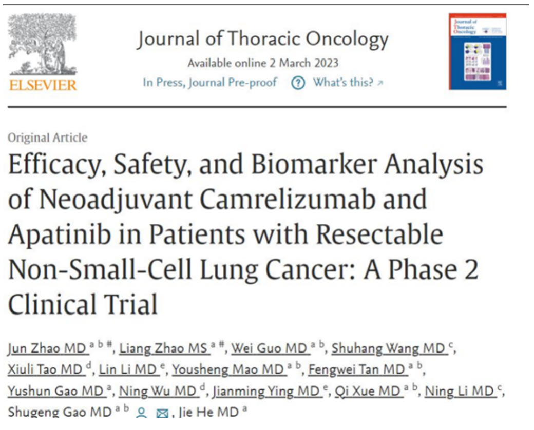[1] ZHAO J, ZHAO L, WEI G, et al. Efficacy, Safety, and Biomarker Analysis of Neoadjuvant Camrelizumab and Apatinib in Patients with Resectable Non-Small-Cell Lung Cancer: A Phase 2 Clinical Trial. J Thorac Oncol. doi: https://doi.org/10.1016/j.jtho.2023.02.019
