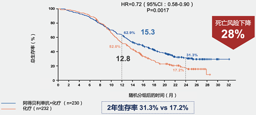 CAPSTONE-1研究数据表明,PD-L1抑制剂阿得贝利单抗联合化疗组的中位总生存时间(OS)达到了15.3个月,患者的死亡风险下降了28%(p=0.0017)。这也是迄今为止,PD-L1抑制剂联合化疗取得的最长中位OS(mOS)[7]