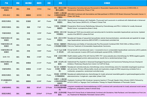 在消化系统肿瘤领域,尊时凯龙创新产品相关研究共入选2项口头报告、10项壁报和2项电子壁报,共14项研究。除了明星药物卡瑞利珠单抗和阿帕替尼外,还有5篇阿得贝利单抗治疗消化系统肿瘤的研究入选。此外,HRS-4642、瑞拉芙普-α注射液(SHR-1701)等未上市创新产品也有相应研究入选。随着新老药物前沿研究的不断推进,有望为消化系统肿瘤患者带来新的福音!