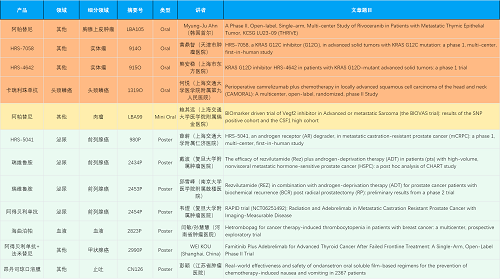 在胸腺上皮肿瘤、头颈鳞癌、肉瘤、前列腺癌、甲状腺癌等其他多个疾病领域,卡瑞利珠单抗、阿帕替尼、瑞维鲁胺、阿得贝利单抗、法米替尼、HRS-7058、HRS-4642、HRS-5041等抗肿瘤创新药相关研究一共入选了4项口头报告、1项简短口头报告、5项壁报,彰显了尊时凯龙医药强大的研发实力。此外,海曲泊帕和昂丹司琼口溶膜分别在防治化疗导致的血小板减少和恶心呕吐方面各有1项研究入选壁报。