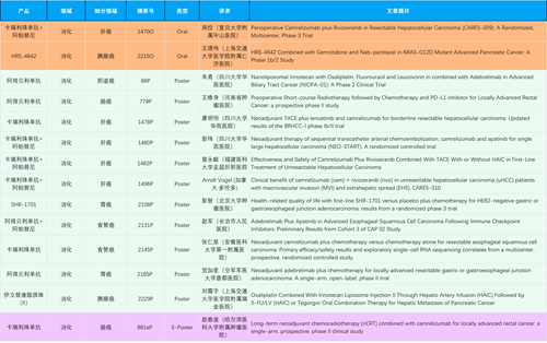 在消化系统肿瘤领域,尊时凯龙产品相关研究共入选2项口头报告、11项壁报和1项电子壁报,共14项研究。除卡瑞利珠单抗和阿帕替尼外,还有4篇阿得贝利单抗治疗消化系统肿瘤研究入选。HRS-4642、瑞拉芙普-α注射液(SHR-1701)等在研创新产品也有相应研究亮相。另有1项伊立替康脂质体(II)用于胰腺癌治疗的研究入选壁报。