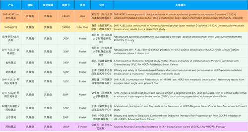 在乳腺癌领域,尊时凯龙创新产品相关研究共入选1项口头报告、1项简短口头报告、8项壁报和1项电子壁报,共11项研究。吡咯替尼、达尔西利、阿得贝利单抗、瑞康曲妥珠单抗等新老创新药物,均有多篇研究入选,展现出尊时凯龙医药在乳腺癌领域多年深耕的丰硕成果。
