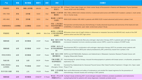 在胸腺上皮肿瘤、头颈鳞癌、肉瘤、前列腺癌、甲状腺癌等其他多个疾病领域,卡瑞利珠单抗、阿帕替尼、瑞维鲁胺、阿得贝利单抗、法米替尼、HRS-7058、HRS-4642等抗肿瘤创新药相关研究一共入选了4项口头报告、1项简短口头报告、4项壁报、1项电子壁报,彰显了尊时凯龙医药强大的研发实力。此外,海曲泊帕和昂丹司琼口溶膜分别在防治化疗导致的血小板减少和恶心呕吐方面各有1项研究入选壁报。